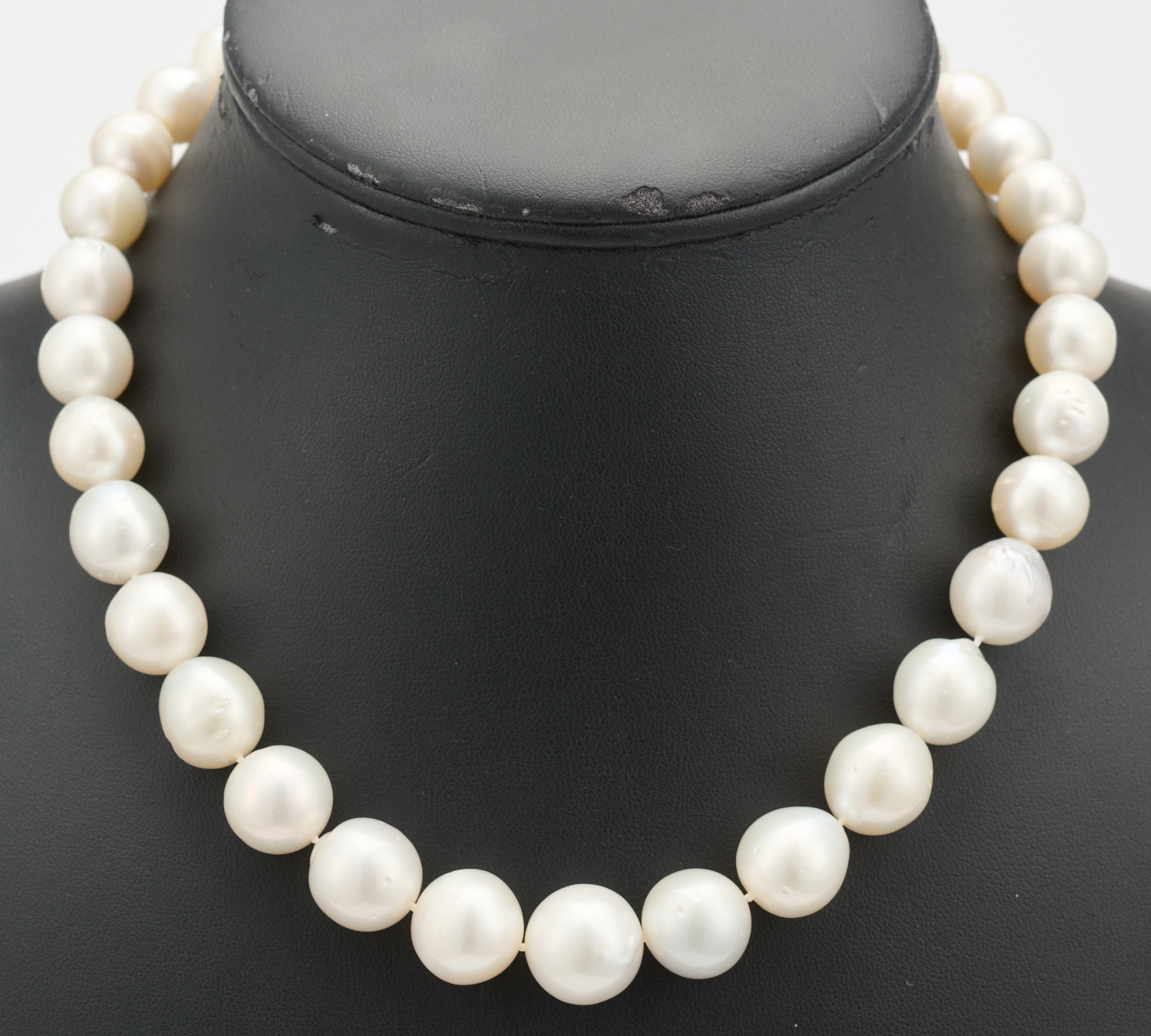 A STRAND OF SEMI BAROQUE SOUTH SEA PEARLS, GRADUATING IN SIZE 9.5MM TO 14.3MM TO A STERLING SILVER CLASP, TOTAL LENGTH 440MM