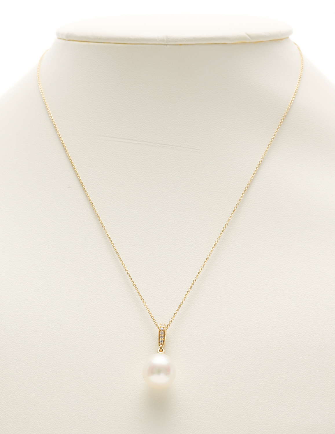 A SOUTH SEA PEARL AND DIAMOND PENDANT IN GILT SILVER BY AUTORE, THE NEAR ROUND PEARL MEASURING 10.85MM, WITH DIAMOND SET BALE, ON A SILVER GILT CHAIN