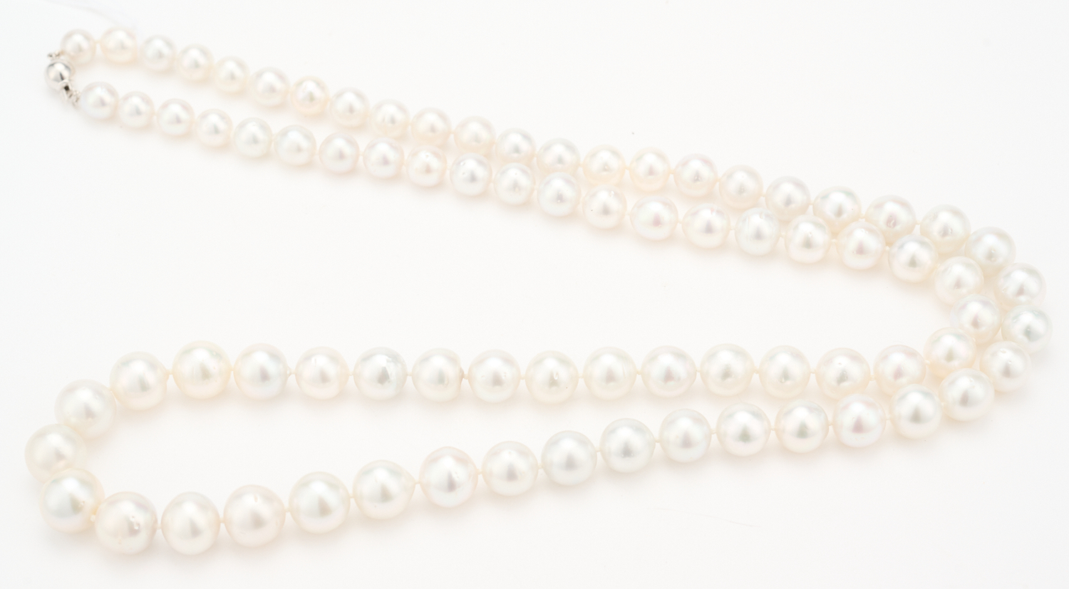 A LONG STRAND OF SOUTH SEA PEARLS COMPRISING SEVENTY NINE PEARLS OF SILVER WHITE HUES, MEASURING 9.35MM TO 13.5MM, TO A STERLING SILVER BALL CLASP, TOTAL LENGTH 965MM