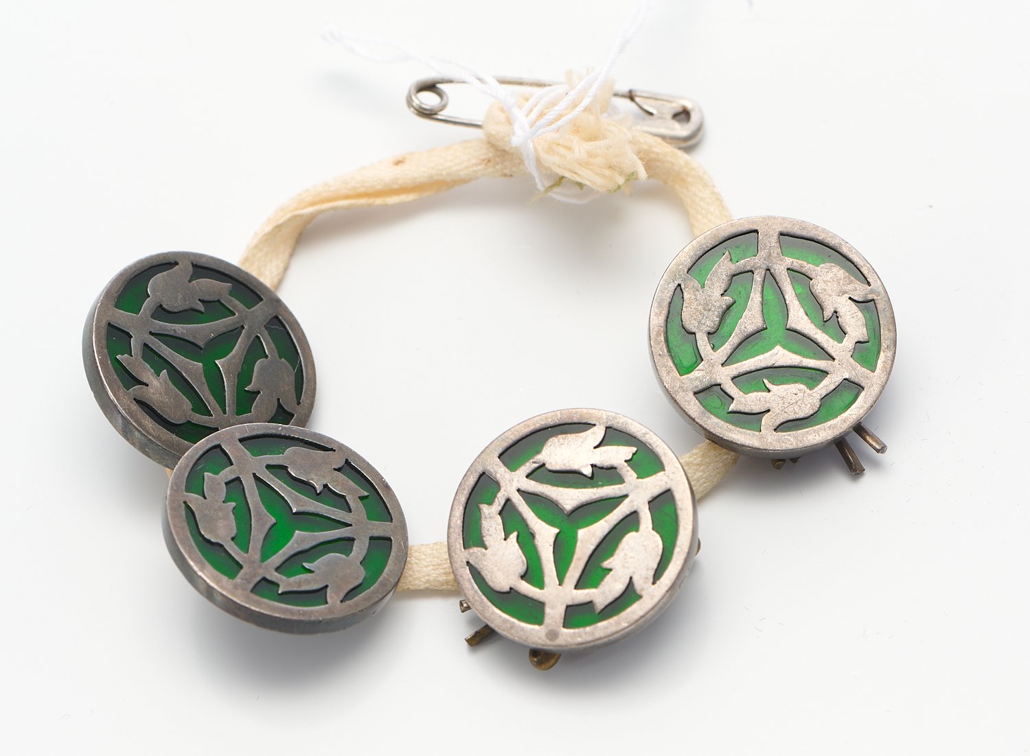 A SET OF SILVER BUTTONS WITH GREEN ENAMEL, HALLMARKED BIRMINGHAM, 1907, MAKER L.E