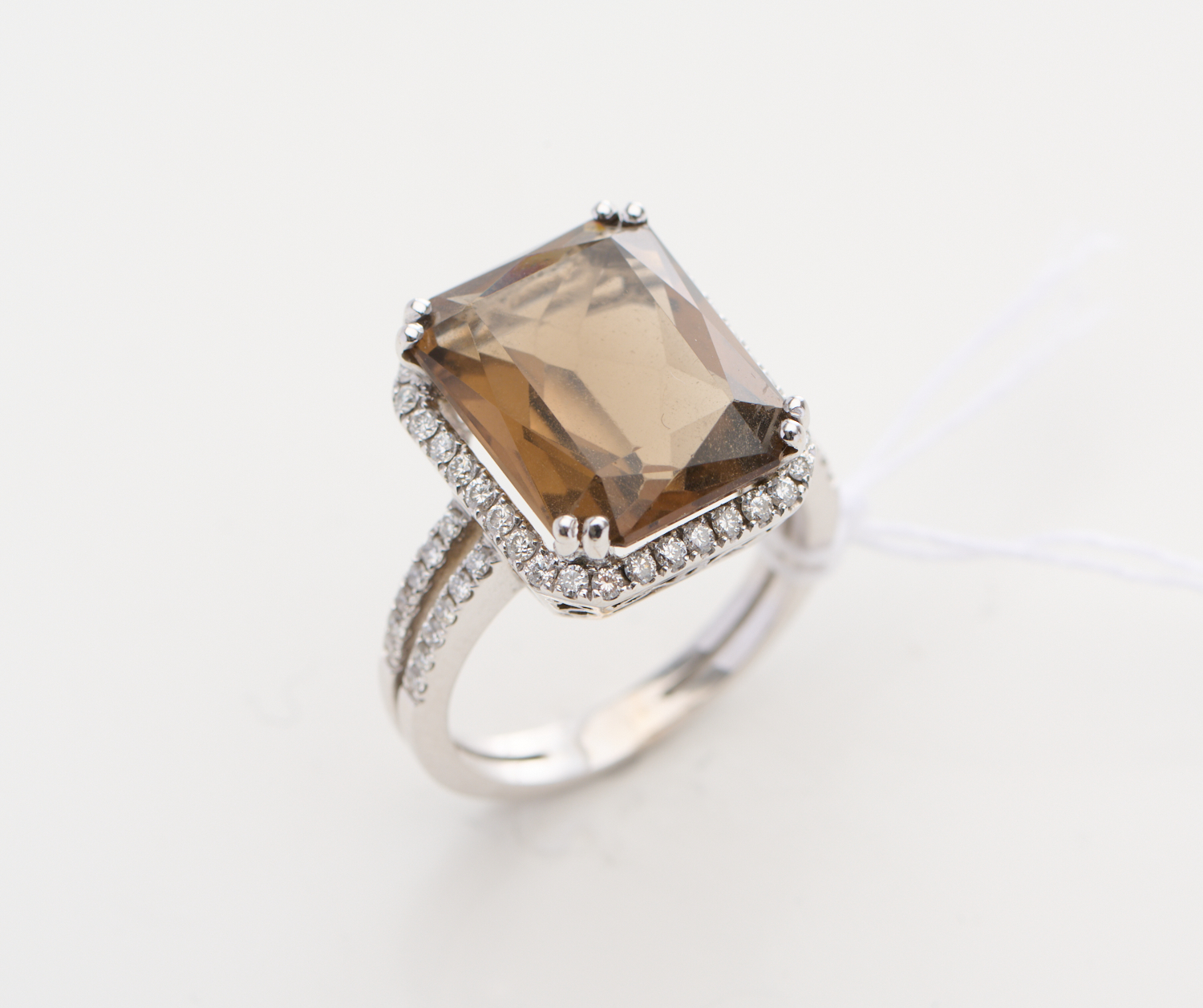 A SMOKEY QUARTZ AND DIAMOND RING IN 18CT WHITE GOLD, SIZE P, 9GMS