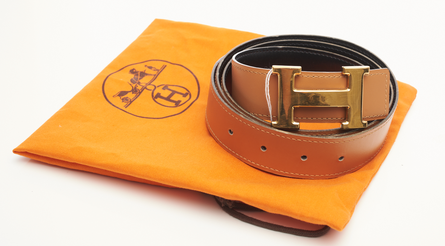 Styled in tan leather with black leather reverse, stamped 'P' in a circle, to a gold tone buckle, labelled size 100.