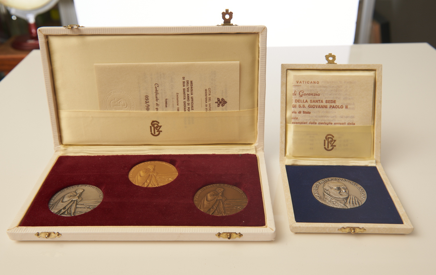 FOUR BOXED PAPAL PRESENTATION MEDALLIONS, LEONARD JOEL LOCAL DELIVERY SIZE: SMALL