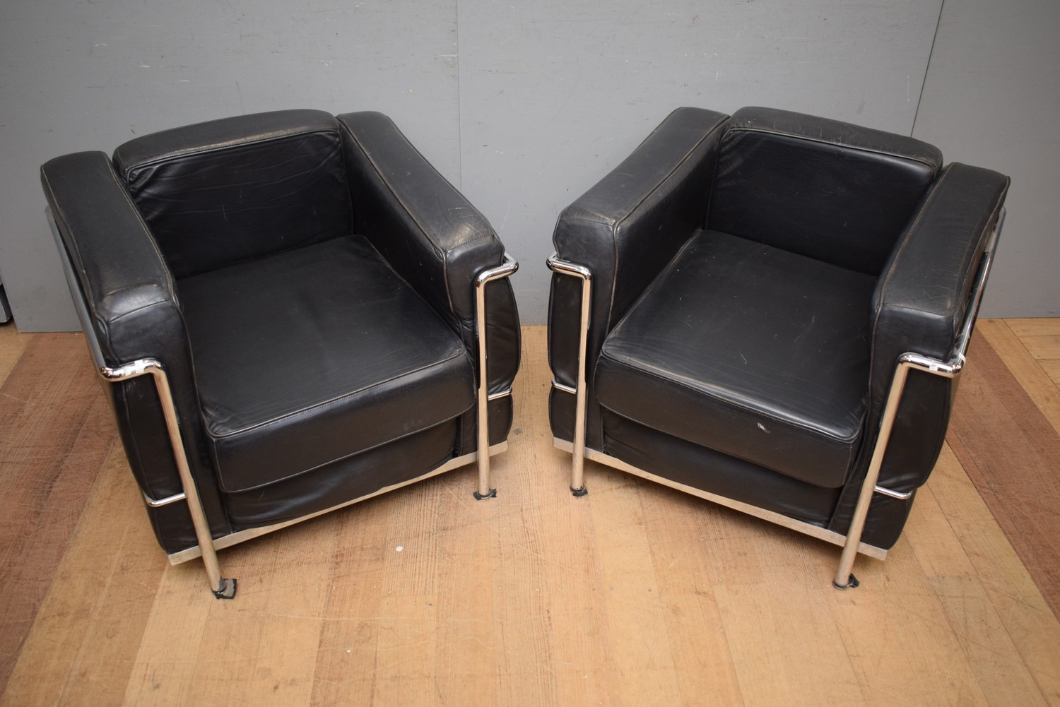 PAIR OF LEATHER & CHROME ARMCHAIRS IN THE STYLE OF LE CORBUSIER (A/F) (67H x 76W x 73D CM) (LEONARD JOEL DELIVERY SIZE: LARGE)