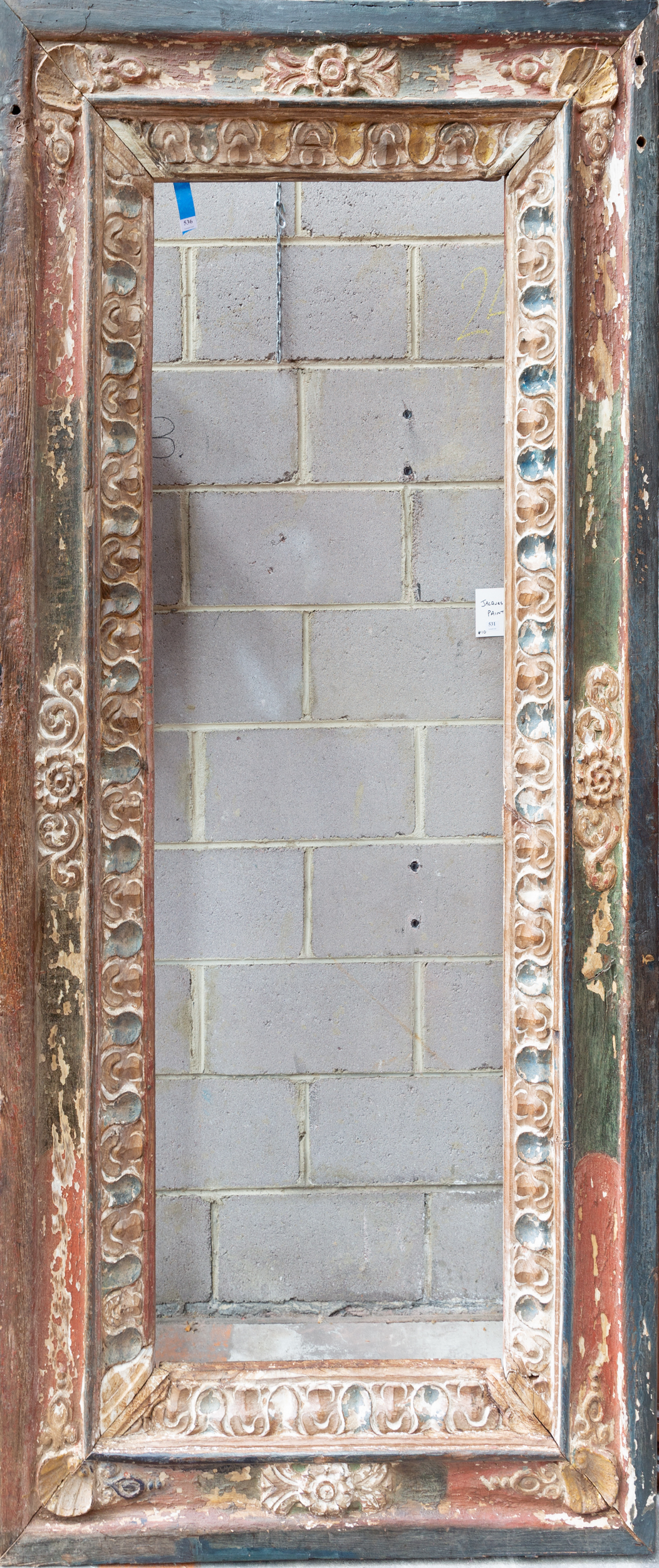 A SUBSTANTIAL RUSTIC CARVED AND POLYCHROME PAINTED OAK FRAME