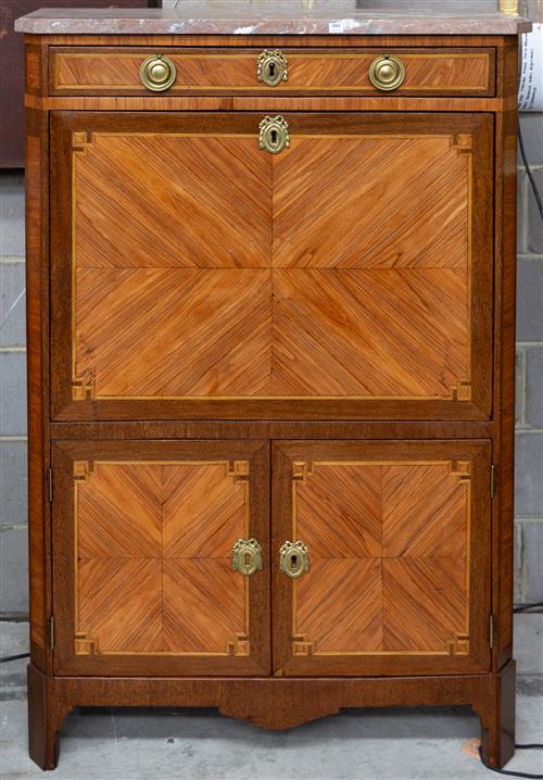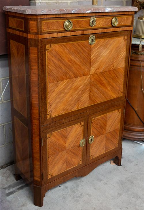 The marble top above a frieze drawer above a fall front with a pair of cabinet doors below. Geometrically veneered in Kingwood and mahogany