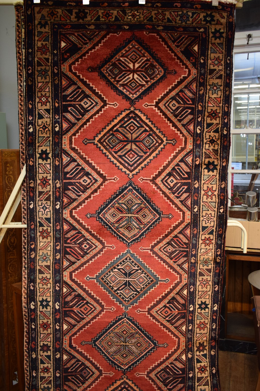 A PERSIAN ZAGHEH HALL RUNNER, 100% WOOL. SOLID & HARD-WEARING. VILLAGE WEAVE WITH CAUCASIAN-INFLUENCED DESIGN OF REPEATING DIAMOND-SHAPED MEDALLIONS AND SEMI-MEDALLIONS IN AN OPEN RED FIELD. GEOMETRIC FLORAL-PATTERNED BORDER. CERTIFICATE OF AUTHENTICITY INCLUDED.INCLUDED. SIZE: 313x115CM ORIGIN: PERSIA - RRP: $1,900