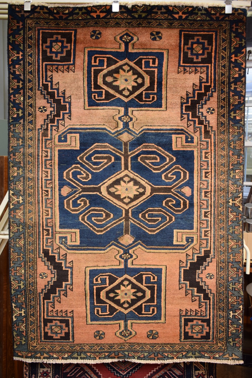 A CIRCA 1960S TRIBAL ABHAR. 100% WOOL & NATURAL DYES. HAND KNOTTED VILLAGE WEAVE WITH TRIBAL DESIGN WITH BOLD ANCHORED MEDALLION IN A PRUSSIAN BLUE TONE. SET IN A MELLOW RUST TONED FIELD. CERTIFICATE OF AUTHENTICITY INCLUDED.  SIZE: 188X125CM ORIGIN: PERSIA - RRP: $1,300