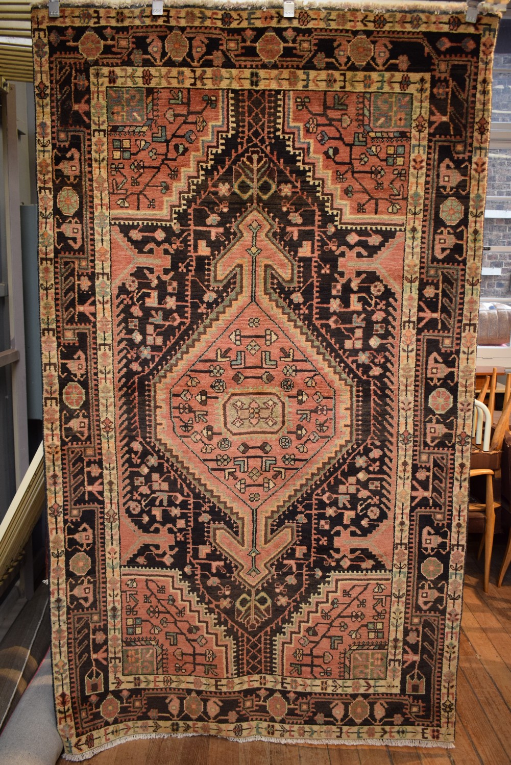A NOMADIC MELLOW COLOUR PERSIAN TOYSERKAN. 100% WOOL PILE. NATURAL DYES. HAND-KNOTTED VILLAGE WEAVE WITH DISTINCT DESIGN OF ANCHORED MEDALLION AND CORNER MEDALLIONS IN A CHARCOAL-TONED FIELD OF FLORAL PATTERNS. BORDER OF FLOWER HEADS. CERTIFICATE OF AUTHENTICITY INCLUDED. SIZE: 259X145CM ORIGIN: PERSIA - RRP: $2,500