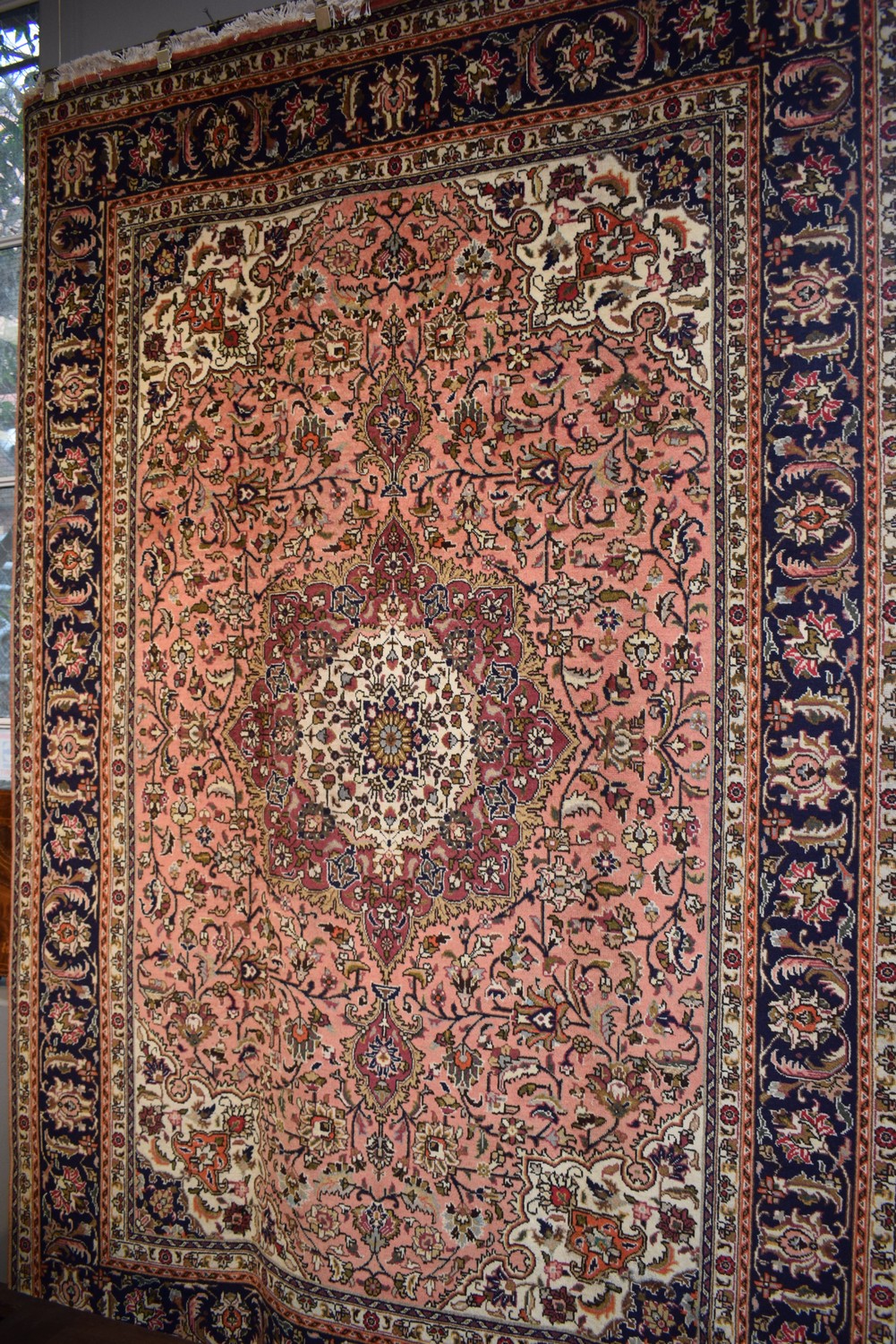 A SUPERB PERSIAN TABRIZ AZARSHAHR. 100% WOOL PILE. SUPERB DENSE WEAVE, EXTREMELY STURDY. CLASSIC TABRIZ DESIGN OF BOLD FLORAL MEDALLION AND QUARTER CORNER MEDALLIONS, IN A ROSE TONED FIELD OF PALMETTES AND TENDRILS. MAJOR BORDER OF PALMETTES AND TENDRILS. CERTIFICATE OF AUTHENTICITY INCLUDED. SIZE: 300X200CM ORIGIN: PERSIA - RRP: $4,500
