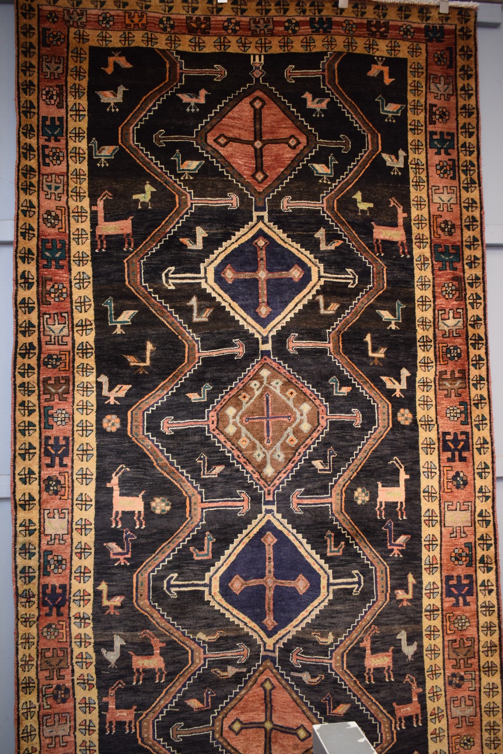 A TRIBAL SONQOR KOLYAIE RUG. 100% HAND SPUN WOOL. NATURAL DYES. HAND-KNOTTED VILLAGE WEAVE FROM THE KURDISTAN PROVINCE WITH TRIBAL DESIGN OF BOLD ANCHORED MEDALLION AND CORNER MEDALLION CONTAINING FLORAL PATTERN AND BIRD FORMS IN AN OPEN RED FIELD. CERTIFICATE OF AUTHENTICITY INCLUDED. SIZE: 305x162CM ORIGIN: PERSIA - RRP: $2,900