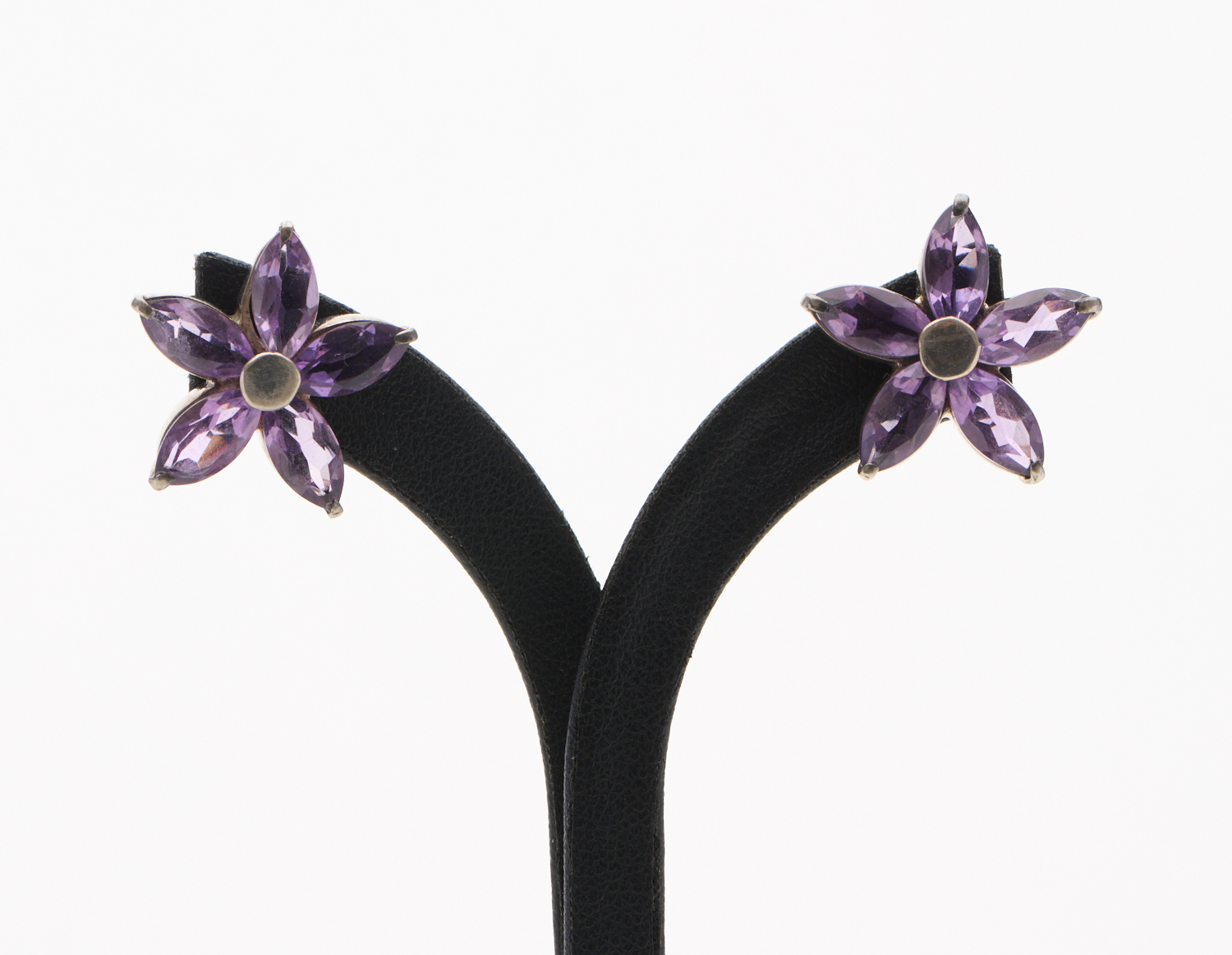 A PAIR OF AMETHYST FLORAL EARRINGS IN SILVER, TO POST FITTINGS, DIAMETER OF THE PLAQUE 20MM