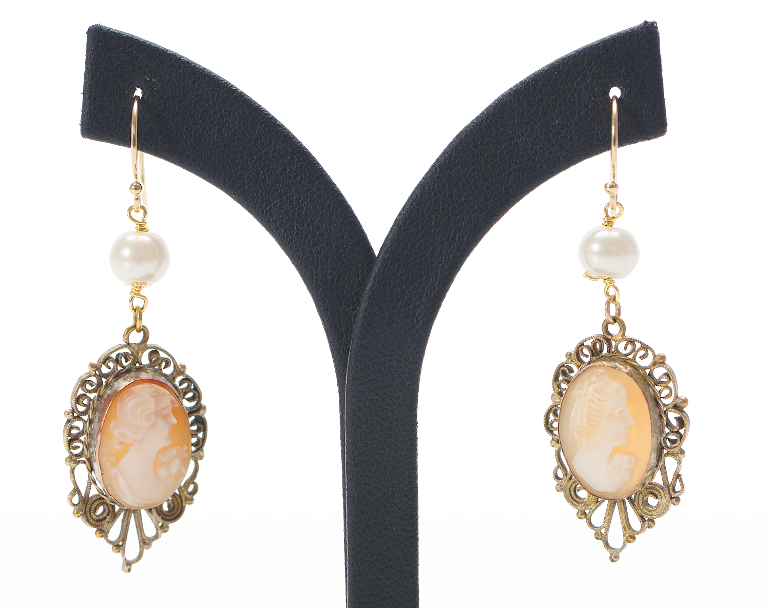 A PAIR OF CAMEO AND PEARL EARRINGS IN SILVER GILT, TO SHEPHERD HOOK FITTINGS, LENGTH 46MM