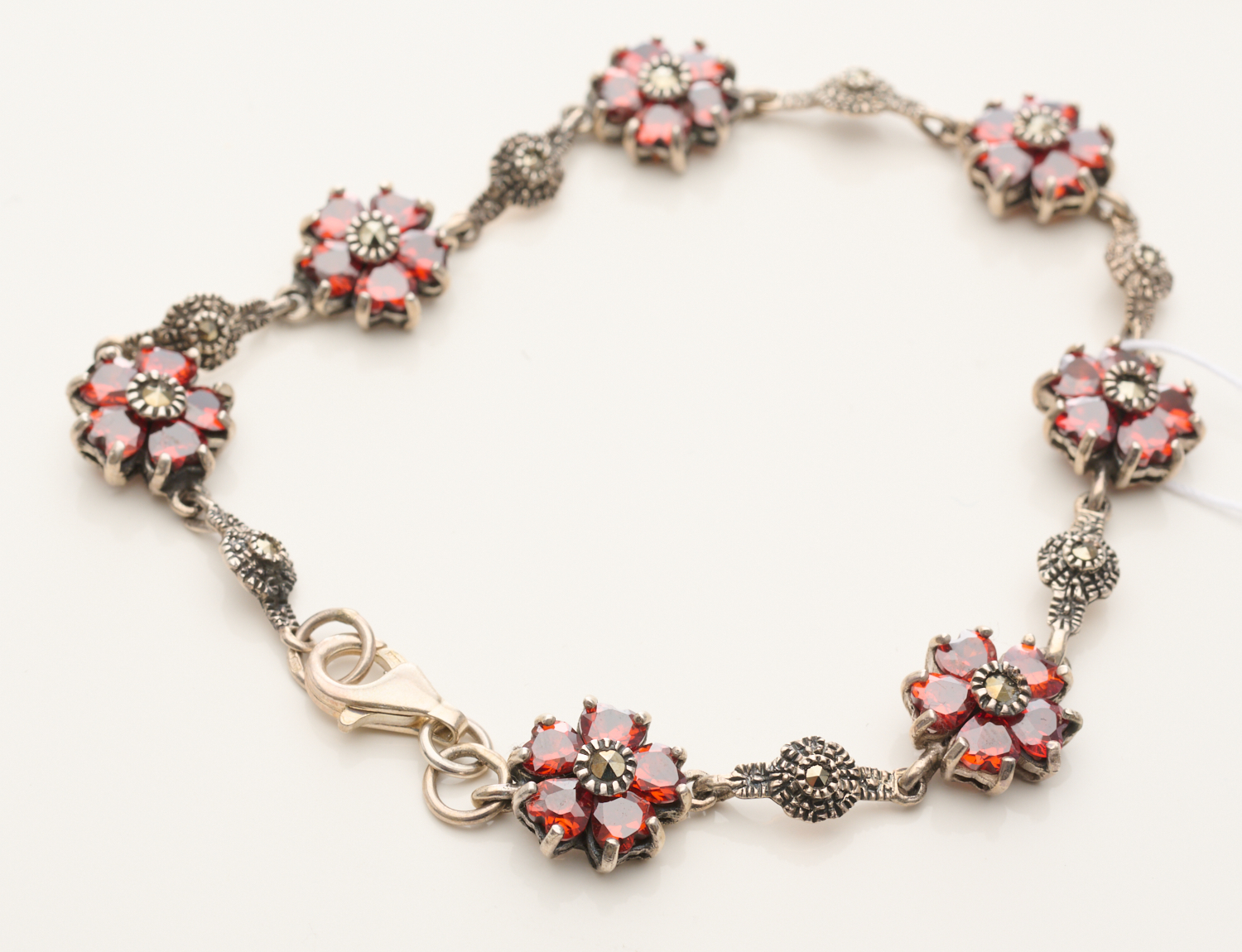 A SILVER GARNET AND MARCASITE BRACELET IN SILVER, LENGTH 20CMS