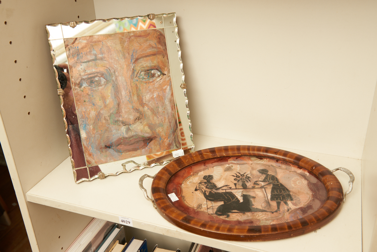 A DECO BEVELLED GLASS PORTRAIT (29 X 24 CM) AND A HAND PAINTED DECO TRAY (25H X 34W CM), LEONARD JOEL LOCAL DELIVERY SIZE: SMALL