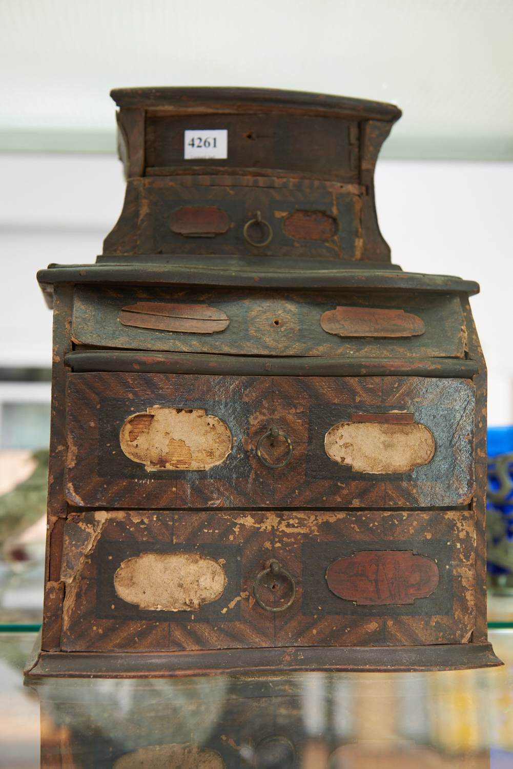 A CONTINENTAL POLYCHROME PAINTED PINE MINIATURE BUREAU