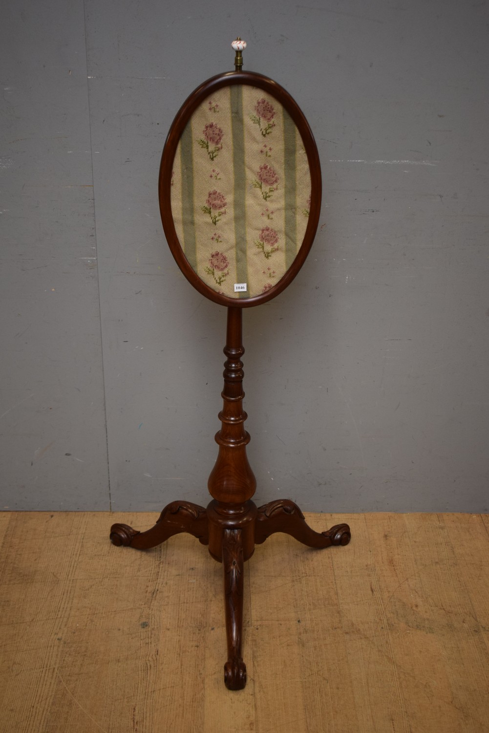 A VICTORIAN CEDAR FRAMED TAPESTRY POLE SCREEN WITHN BRASS AND CERAMIC POLE (130H x 63D CM) (LEONARD JOEL DELIVERY SIZE: MEDIUM)