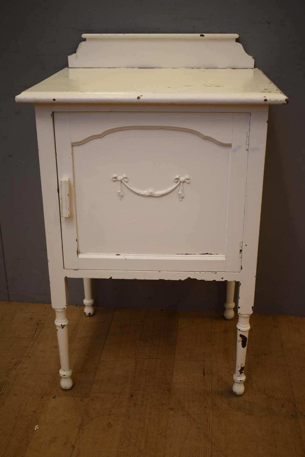A 1940S ENGLISH PAINTED WHITE SINGLE DOOR WOODEN CABINET (A/F) (H89 X W57 X D45 CM) (LEONARD JOEL DELIVERY SIZE: LARGE)