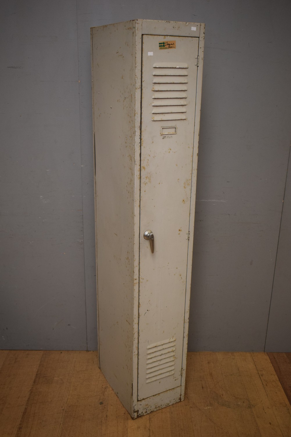 A TALL 1950S BROWNBUILT METAL SINGLE LOCKER WITH INNER SHELF AND WORKING ORIGINAL HANDLE (A/F) (H183 X W31 X D46 CM) (LEONARD JOEL DELIVERY SIZE: LARGE)