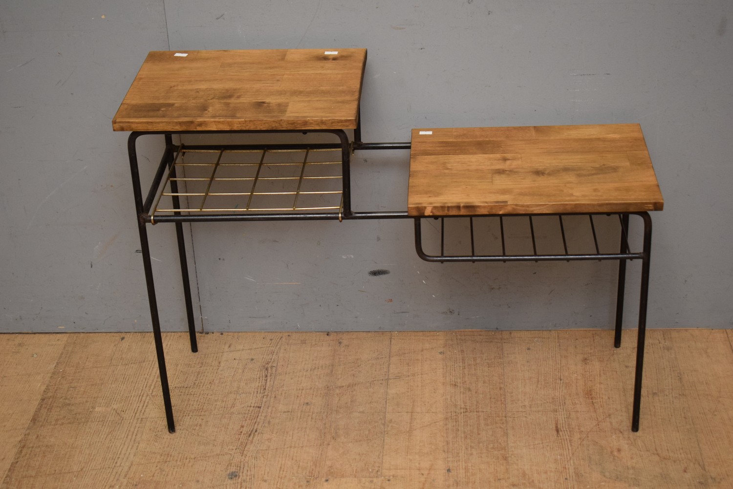 1950S STEEL FRAMED 2 TIER SIDE TABLE WITH WOODEN TOPS AND LOWER BRASS MAGAZINE RACKS (61H X 86W X 31D CM) (LEONARD JOEL DELIVERY SIZE: MEDIUM)