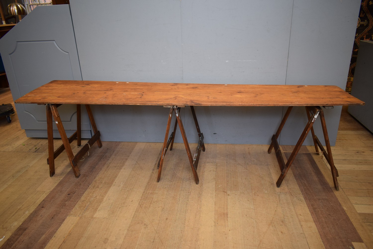 LARGE EXTRA LONG 1950S FORMER AUSTRALIAN SCOUT GROUP 3 FOLDING LEG PINE TOPPED TRESSLE TABLE (A/F) (H81 X W302 X D69 CM) (PLEASE NOTE THIS HEAVY ITEM MUST BE REMOVED BY CARRIERS AT THE CUSTOMER'S EXPENSE. LEONARD JOEL STAFF CANNOT ASSIST CARRYING THIS ITEM) (X-LARGE ITEM)