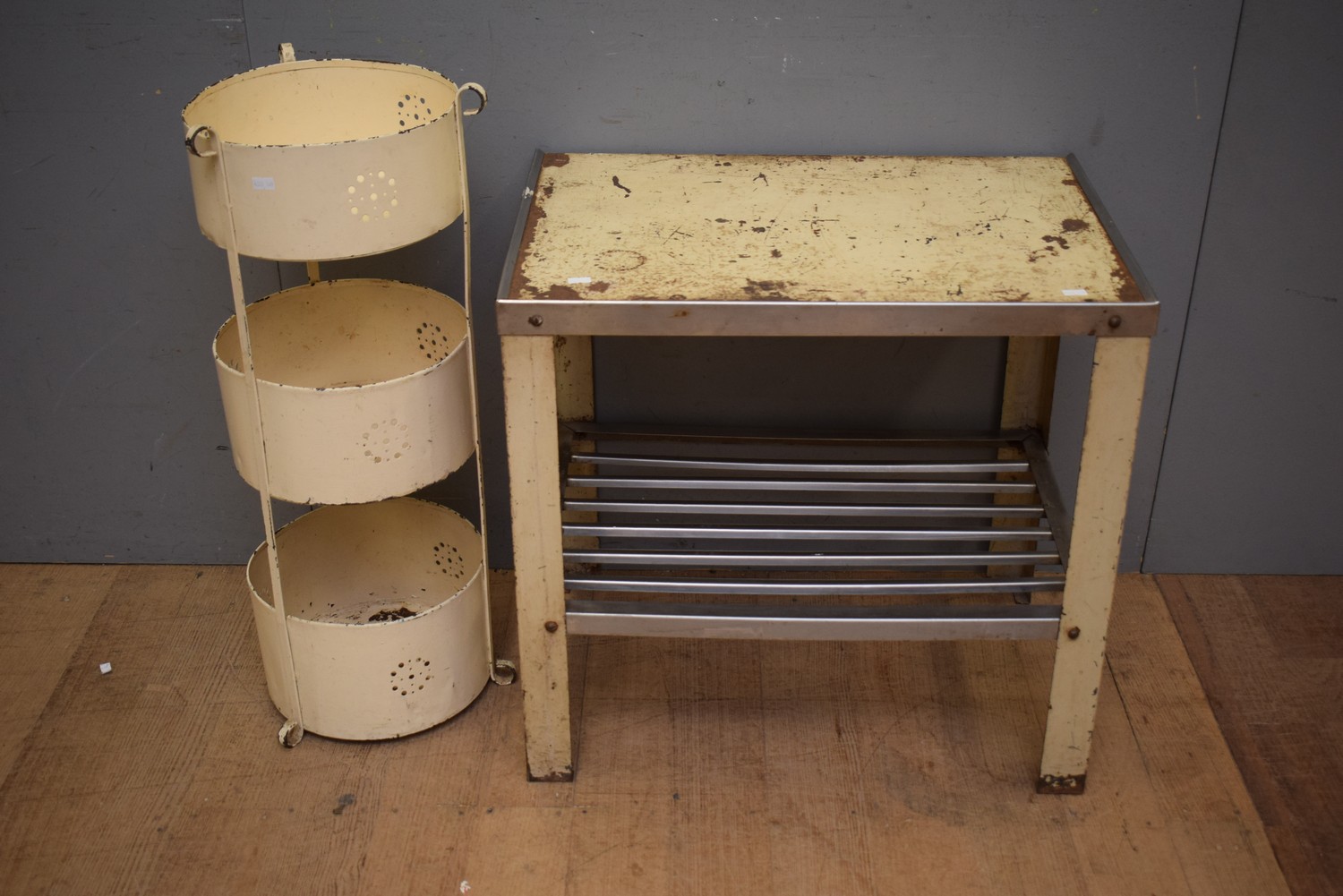 2 PIECE - 1920S METAL THREE TIER CIRCULAR FOOD STORAGE BIN AND 2 TIER METAL AND STEEL RECTANGULAR INDUSTRIAL SHELF (H60 X W62 X D41 CM) (LEONARD JOEL DELIVERY SIZE: LARGE)