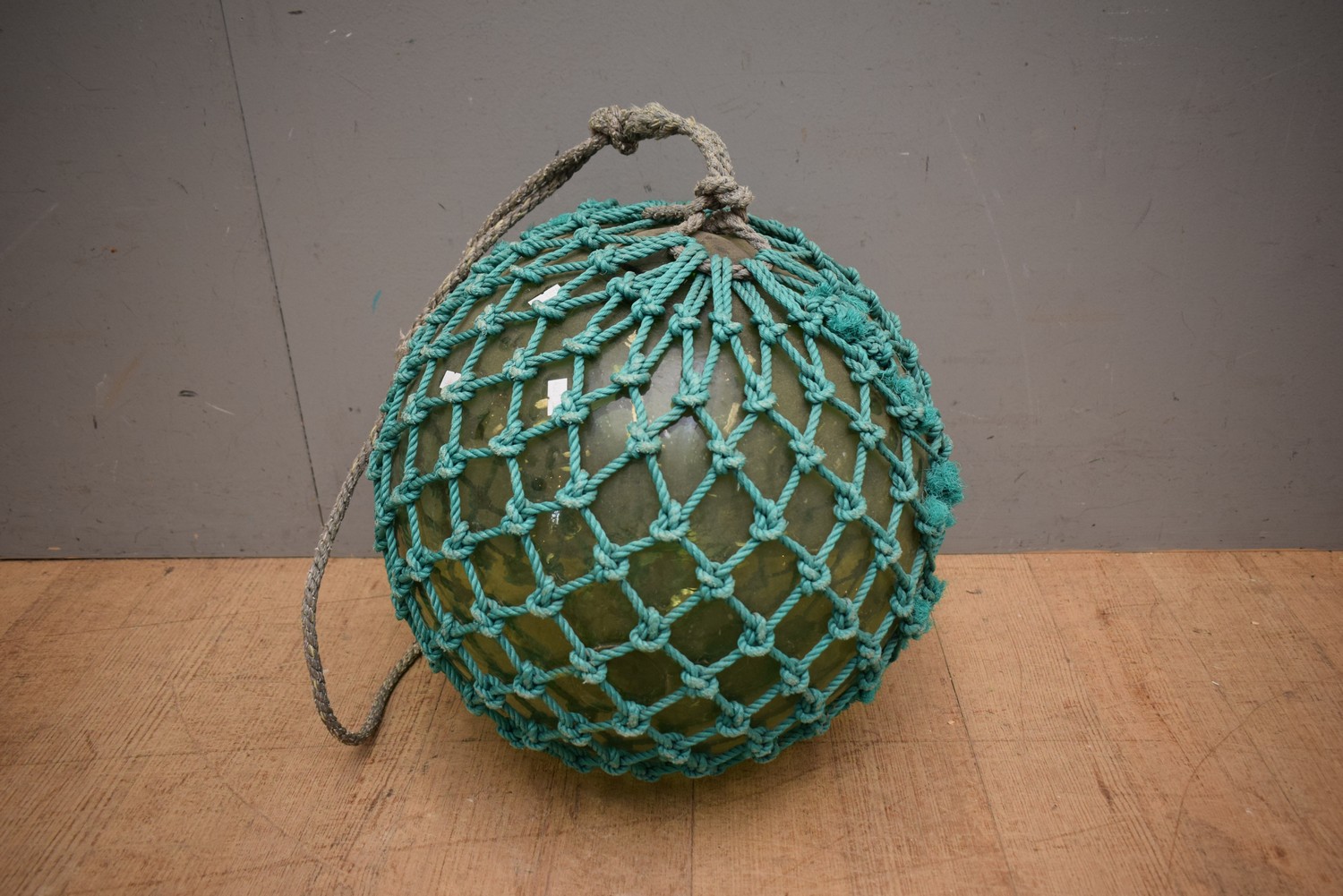 A 1900S GREEN GLASS ROPE COVERED SHIPS FLOAT / FISHING BUOY (42D CM) (LEONARD JOEL DELIVERY SIZE: MEDIUM)
