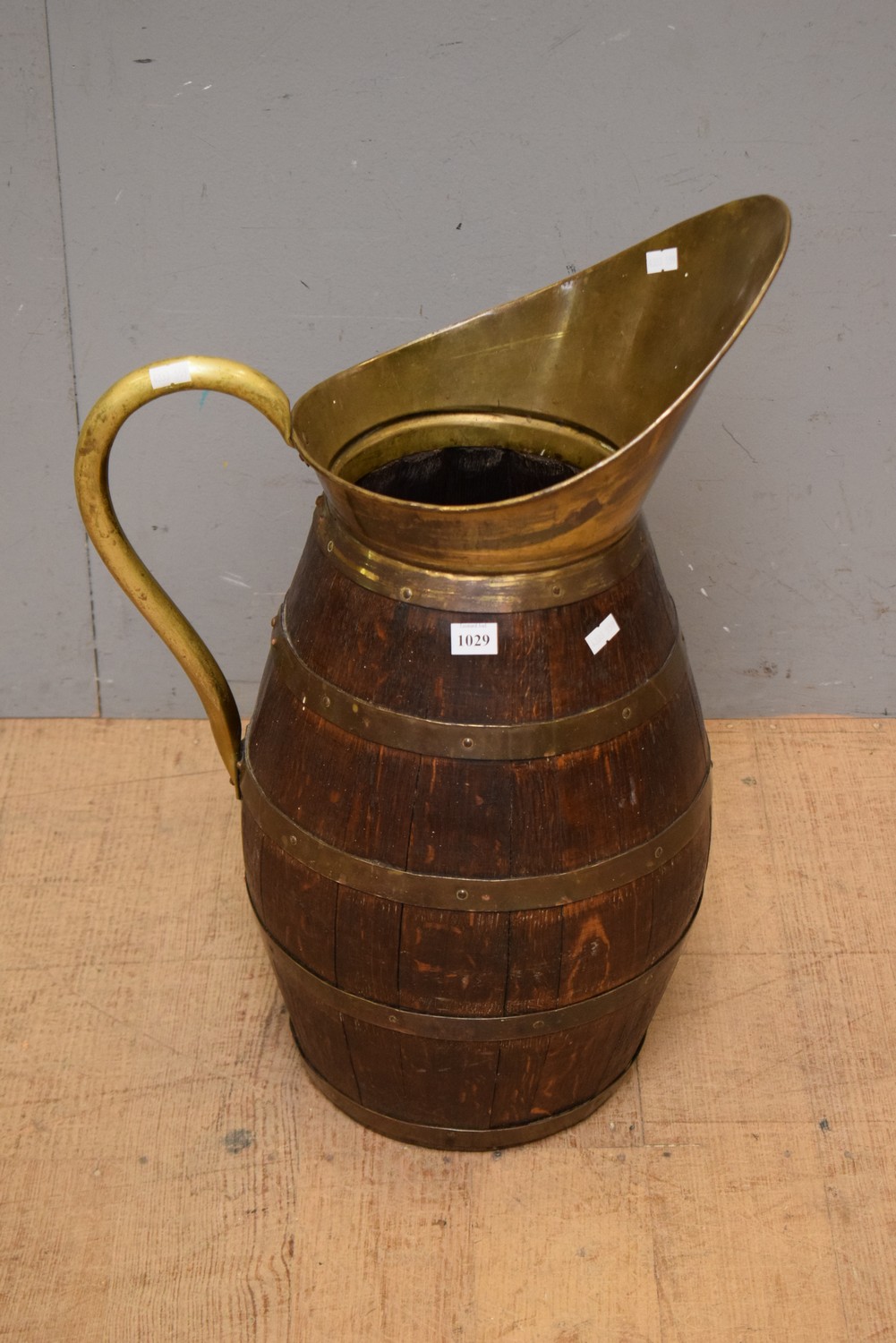 A 19TH CENTURY FRENCH COOPERED BARREL FORM WINE JUG WITH BRASS BANDS HANDLE AND TOP MOUNT (57H x 39W CM) (LEONARD JOEL DELIVERY SIZE: SMALL)