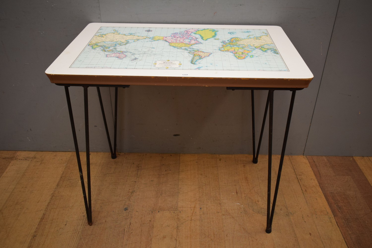 AN AMERICAN RAND MINALLY COSMOPOLITAN WORLD MAP TOPPED TABLE WITH RETRO METAL LEGS (78H x 90W x 59D CM) (LEONARD JOEL DELIVERY SIZE: LARGE)