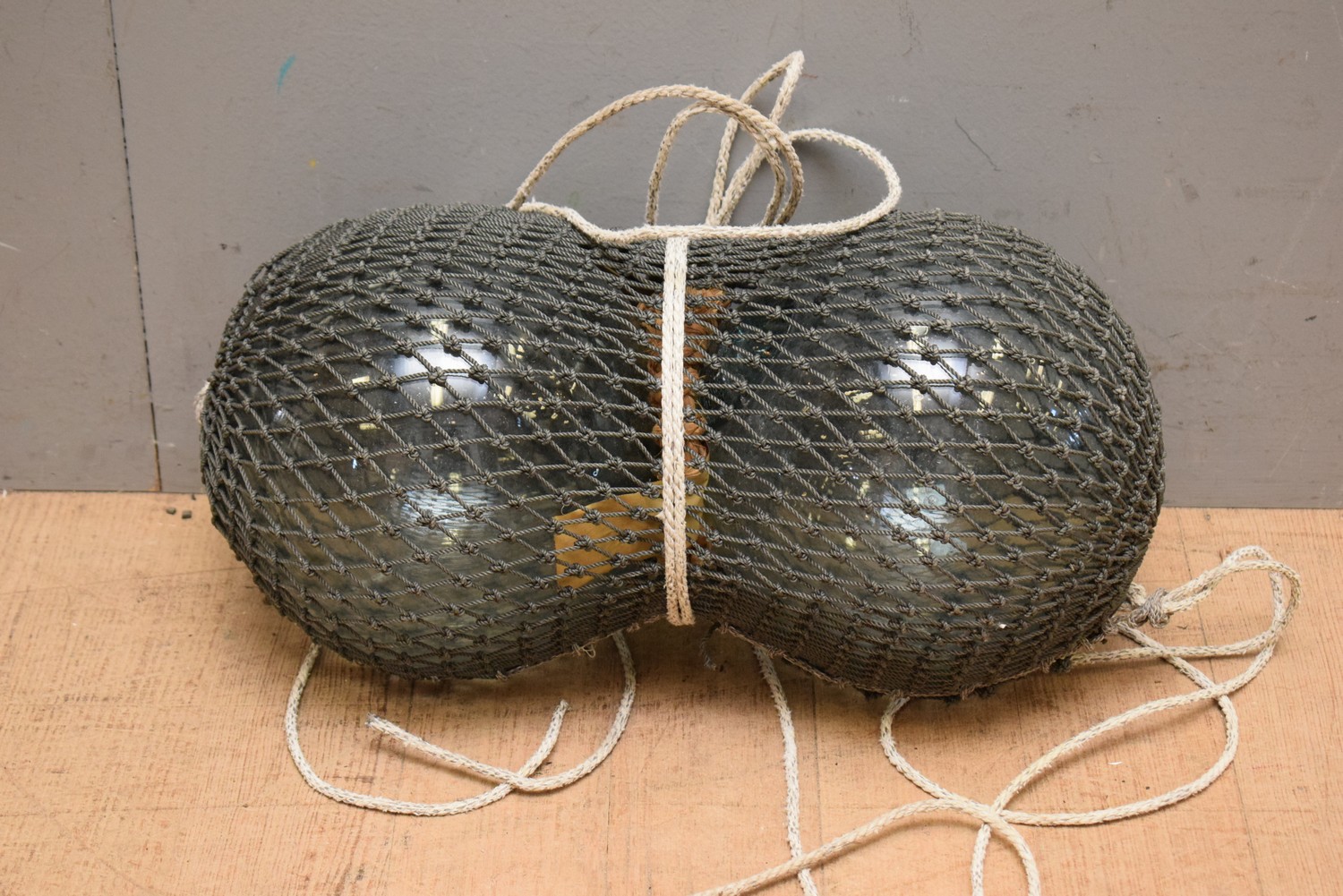 A DOUBLE ROPE COVERED 1940S GLASS SHIPS BUOYS / FISHING FLOATS (50W APPROX CM) (LEONARD JOEL DELIVERY SIZE: MEDIUM)