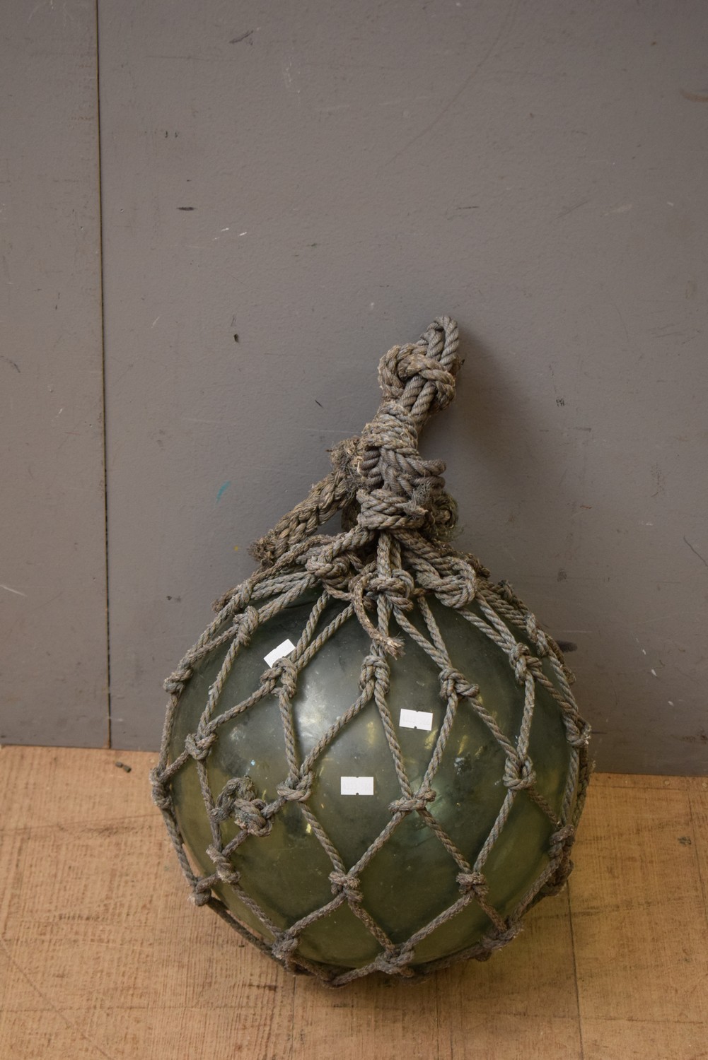 A 1900S GREEN GLASS ROPE BOUND FISHING FLOAT / SHIP BUOY (30D CM) (LEONARD JOEL DELIVERY SIZE: MEDIUM)