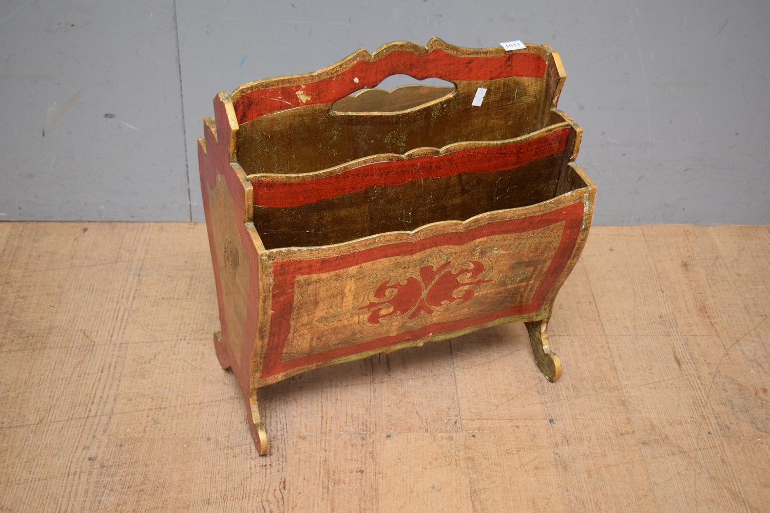 A 1920S ITALIAN GILTWOOD FLORENTINE 4 SECTION MAGAZINE RACK WITH RED HIGHLIGHTS (45H x 39W x 25D CM) (LEONARD JOEL DELIVERY SIZE: SMALL)