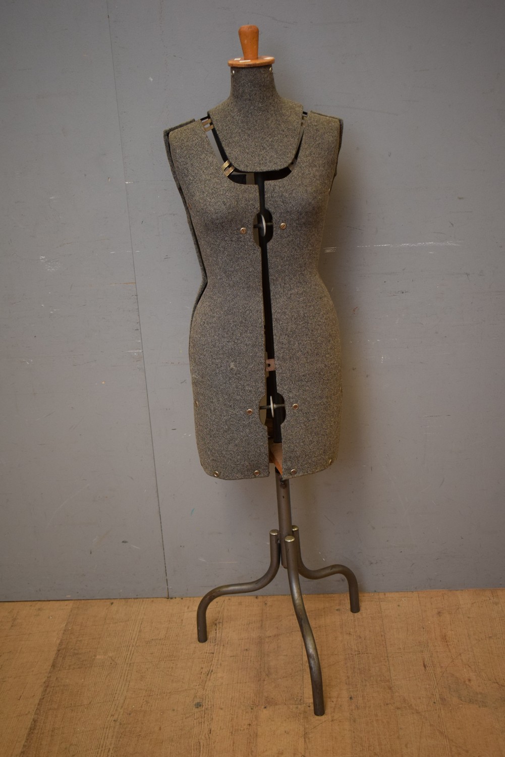 1950S EXPANDABLE FIBERGLASS FABRIC COVERED DRESS FORM MANNEQUIN ON ORIGINAL METAL 3 TIER BASE (H154 CM) (LEONARD JOEL DELIVERY SIZE: MEDIUM)