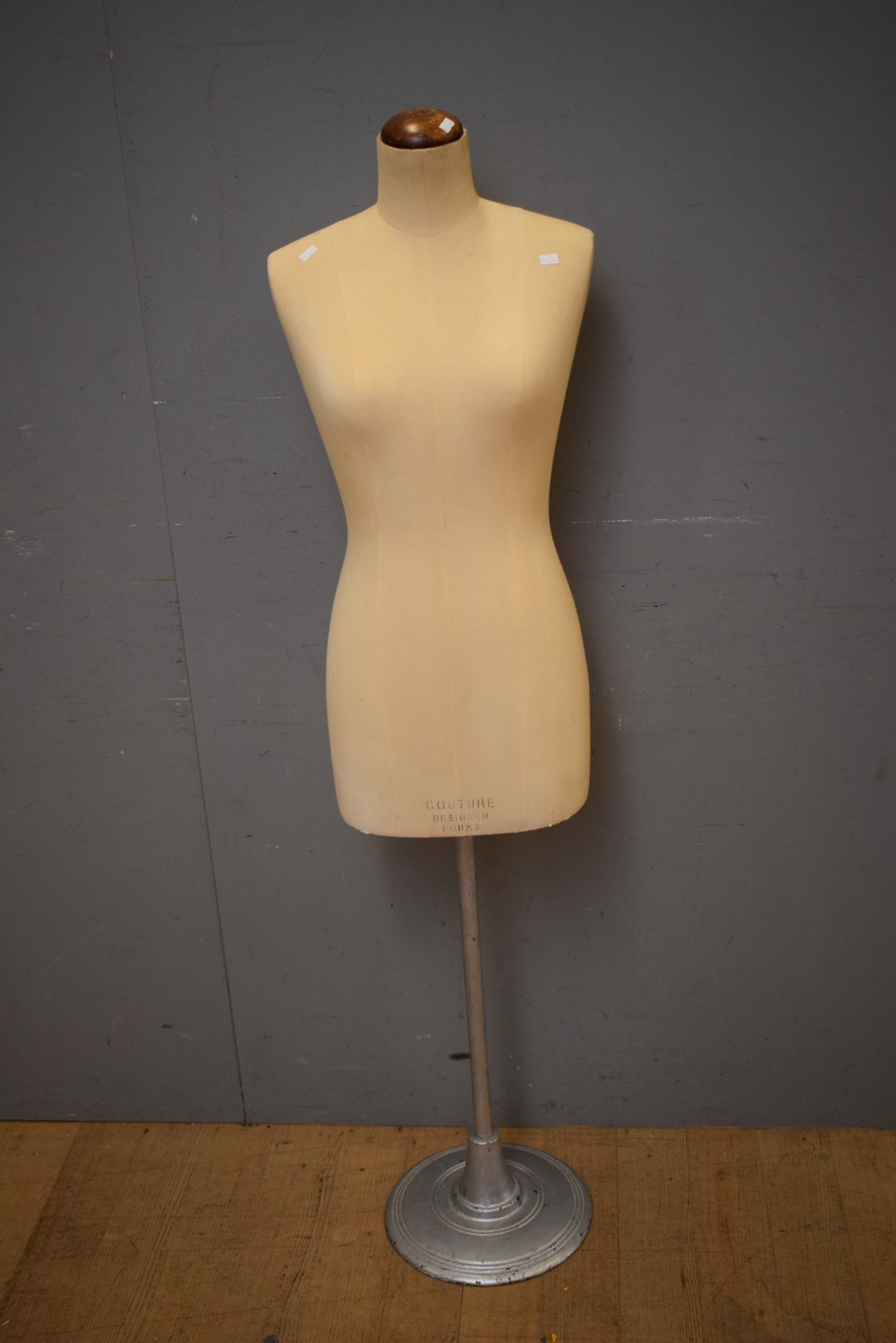 VINTAGE 1950S NATURAL COLOURED MATERIAL COVERED COUTURE DRESS FORM ON ORIGINAL HEAVY METAL BASE (153 CM H)(LEONARD JOEL DELIVERY SIZE: MEDIUM)