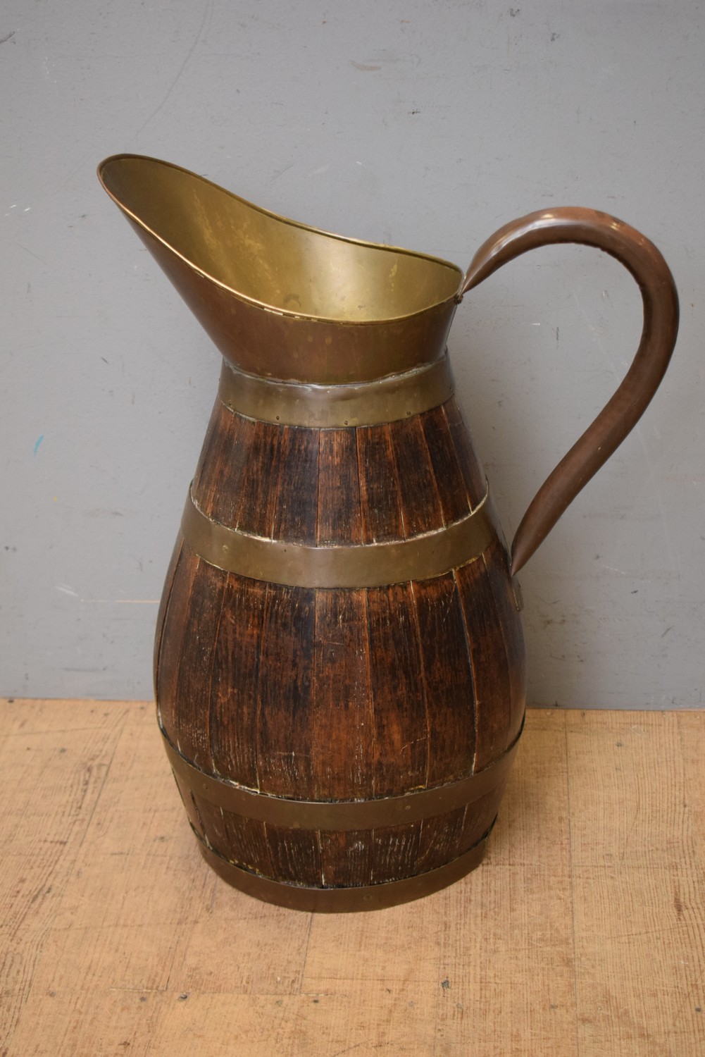 SUPERB LARGE 19TH CENTURY FRENCH COOPERED BARREL FORM WINE JUG WITH BRASS BANDS HANDLE AND TOP MOUNT (60H X 28D CM) (LEONARD JOEL DELIVERY SIZE: SMALL)