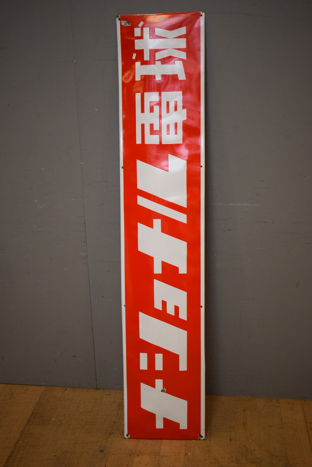 A LARGE 1930S JAPANESE RECTANGULAR RED AND WHITE ENAMEL SHOP SIGN (181H X 36W CM)(LEONARD JOEL DELIVERY SIZE: MEDIUM)