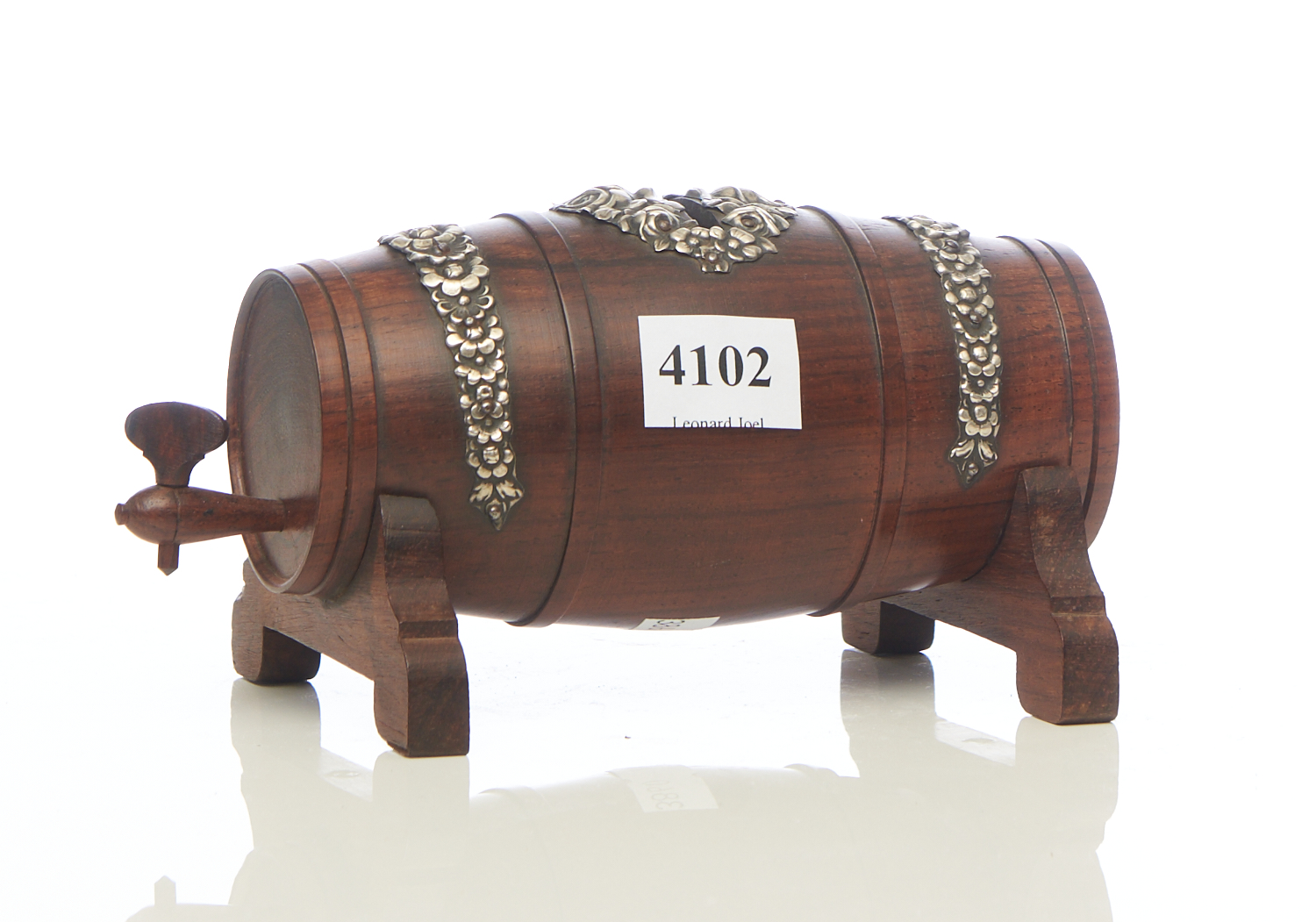 A ROSEWOOD AND APPLIED FLORAL BARREL FORM MONEY BOX, LEONARD JOEL LOCAL DELIVERY SIZE: SMALL