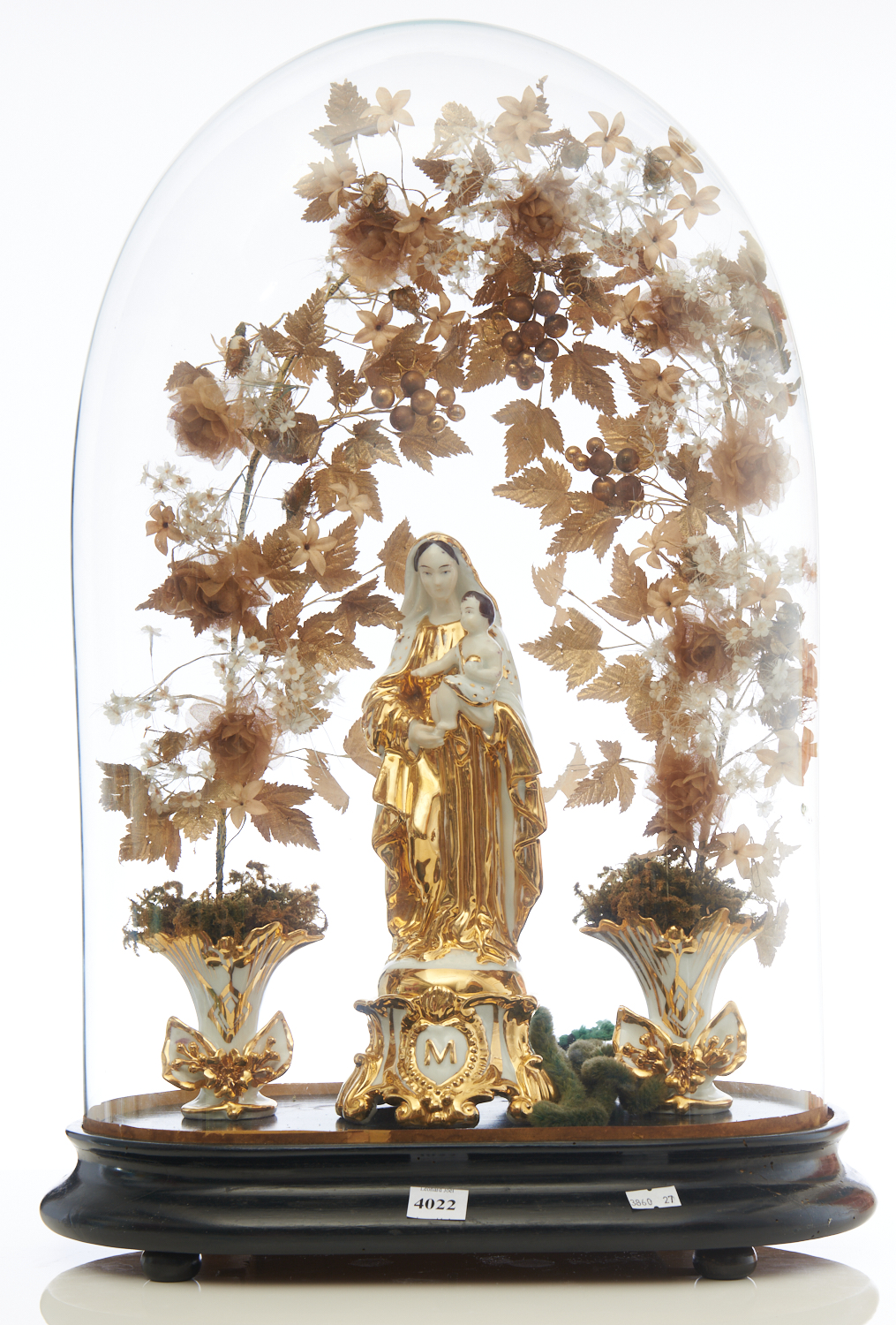 A FRENCH OVAL GLASS DOME ON ORIGINAL EBONISED STAND WITH SILK FLORAL DISPLAY AND CERAMIC FIGURE OF MARY AND JESUS H.51CM, LEONARD JOEL LOCAL DELIVERY SIZE: SMALL