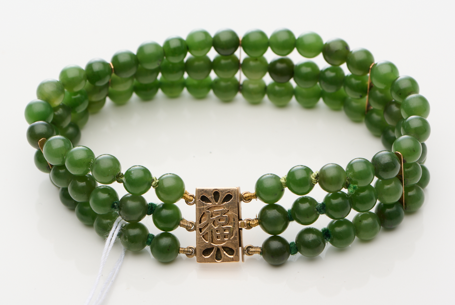 A TRIPLE STRAND NEPHRITE BRACELET COMPRISING SPACERS IN 14CT GOLD, TO A 14CT GOLD CLASP, LENGTH 20CMS