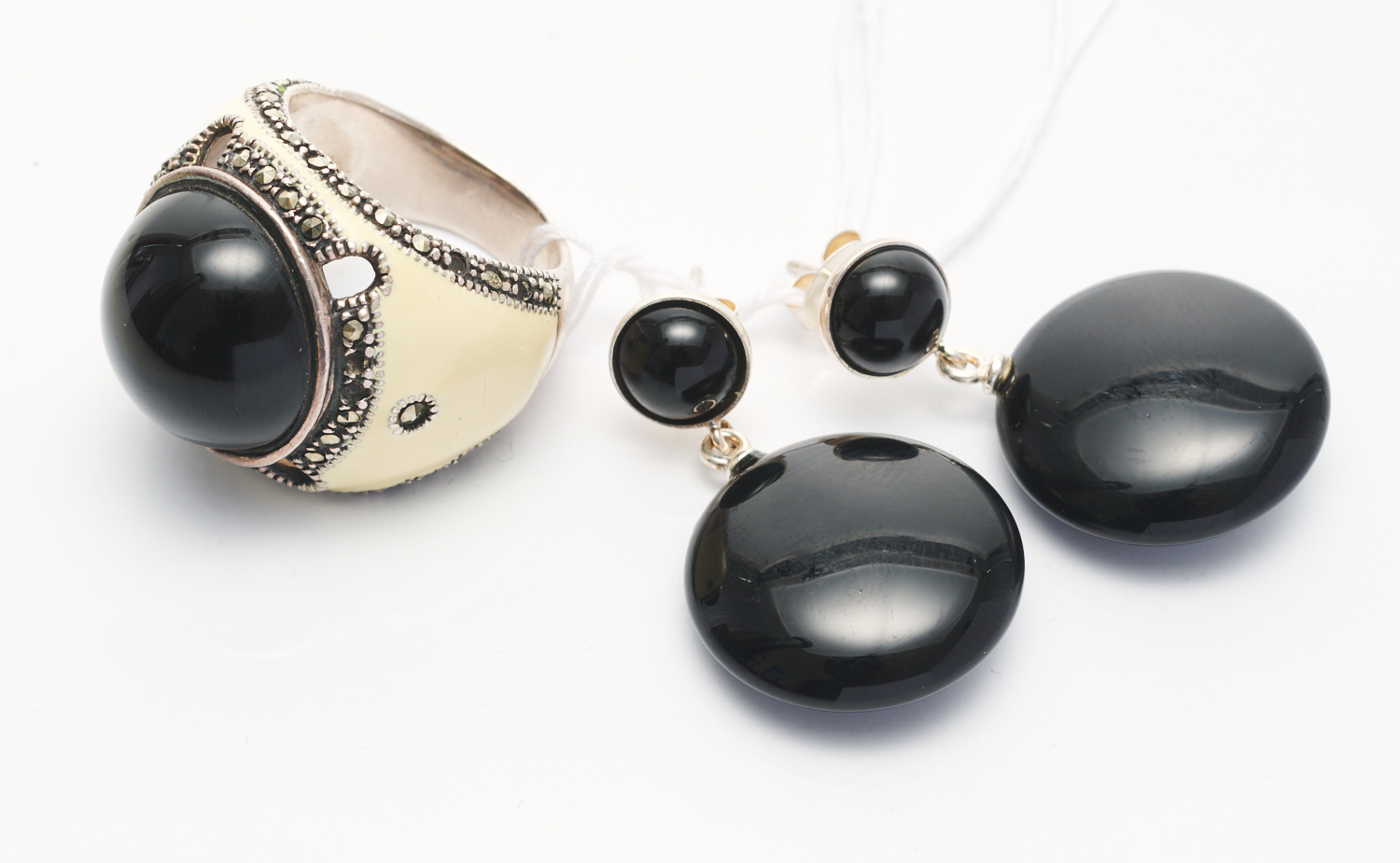 AN ENAMEL AND BLACK COMPOSITE RING IN STERLING SILVER (SIZE O-P), TOGETHER WITH A PAIR OF BLACK ENAMEL EARRINGS TO POST FITTINGS