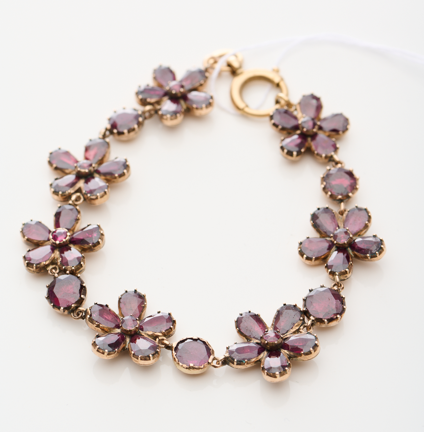 AN ANTIQUE GARNET FLORAL BRACELET IN 9CT GOLD, LENGTH 17CM, 14.5GMS