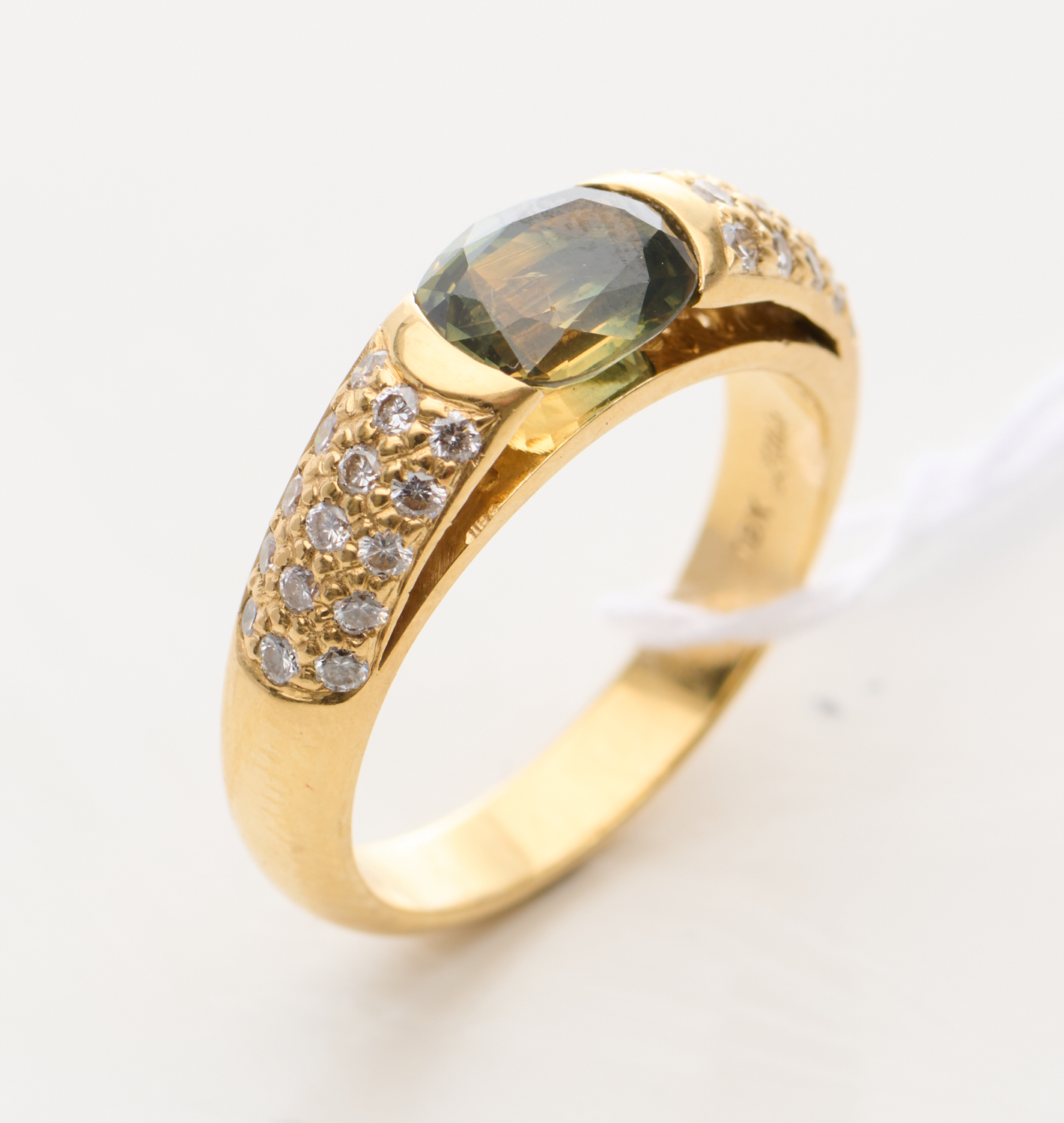 A PARTI SAPPHIRE AND DIAMOND RING IN 18CT GOLD, RING SIZE M, 6.5GMS