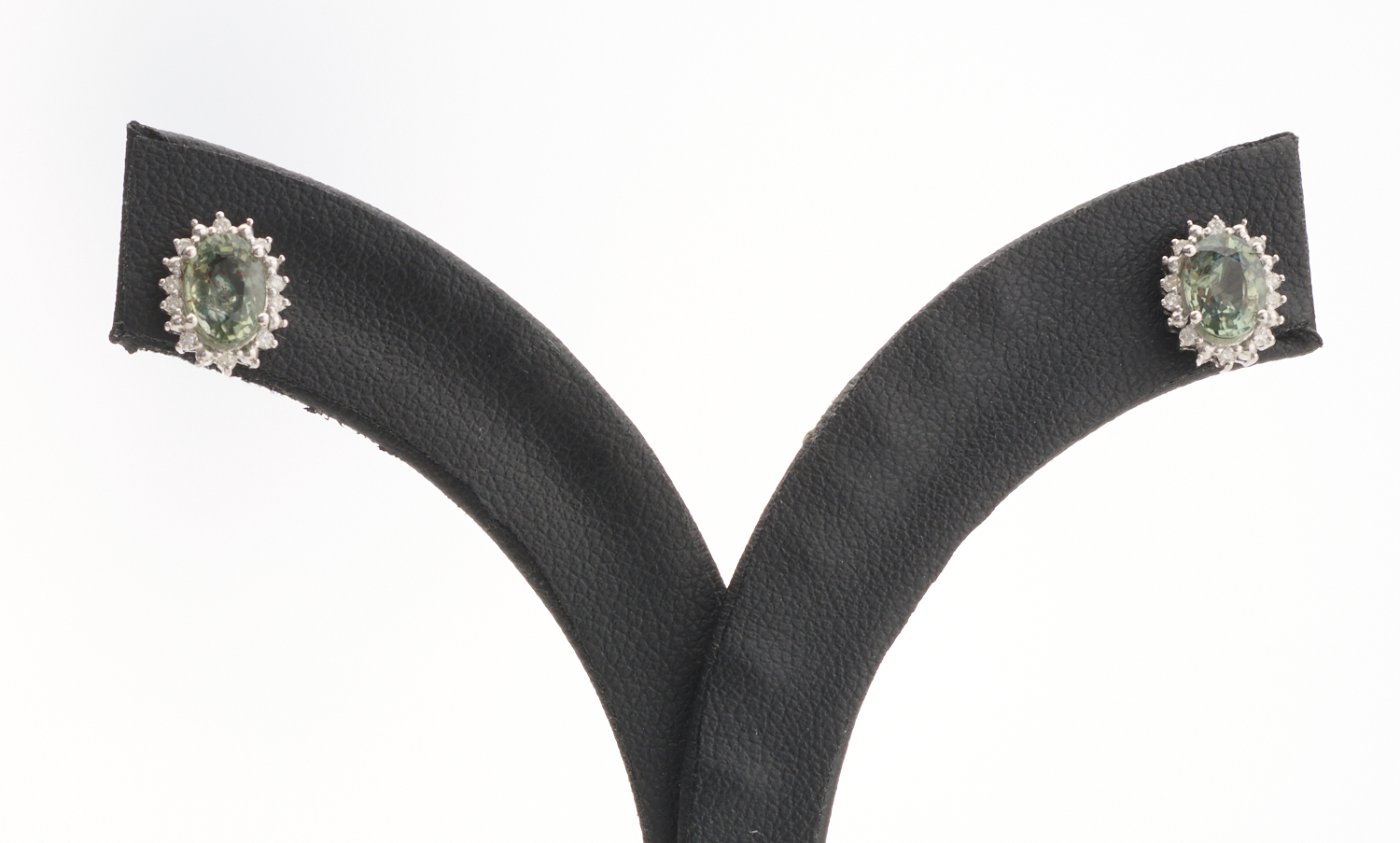 A PAIR OF GREEN SAPPHIRE AND DIAMOND EARRINGS IN 14CT WHITE GOLD, TO POST AND BUTTERFLY FITTINGS