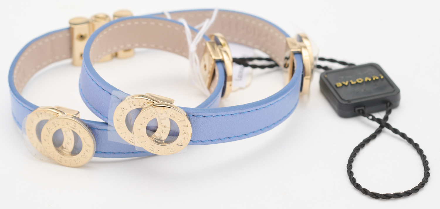 A DOUBLE WRAP BRACELET BY BVLGARI - Styled in baby-blue leather with signed silver tone metal feature discs and conforming hardware, total length 370mm, reference number GS.K10.33130, boxed.