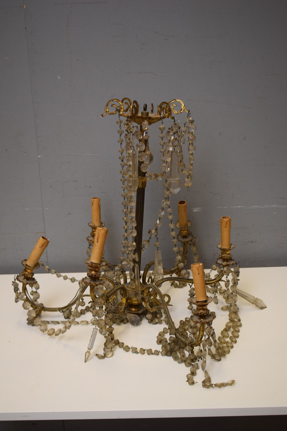 A FRENCH NEOCLASSICAL 6 BRANCH BRONZE & CRYSTAL CHANDELIER C.1930'S (A/F) (H63 X D61 CM) (LEONARD JOEL DELIVERY SIZE: MEDIUM)