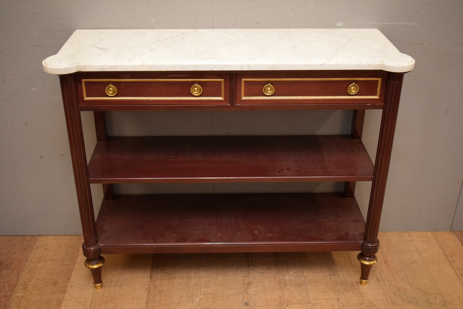 A FRENCH LOUIS XVI MAHOGANY MARBLE TOP CONSOLE TABLE C.1950'S M.HIRCH (A/F) (96H x 120W x 40D CM) (PLEASE NOTE THIS HEAVY ITEM MUST BE REMOVED BY CARRIERS AT THE CUSTOMER'S EXPENSE. LEONARD JOEL STAFF CANNOT ASSIST CARRYING THIS ITEM) (X-LARGE ITEM)