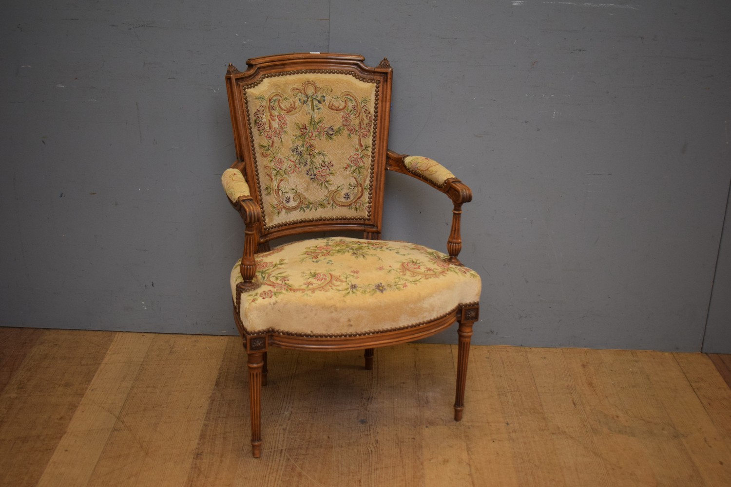A LATE 19TH CENTURY BEECHWOOD TAPESTRY FAUTEUIL C.1890'S (A/F) (85H x 56W x 57D CM) (LEONARD JOEL DELIVERY SIZE: LARGE)