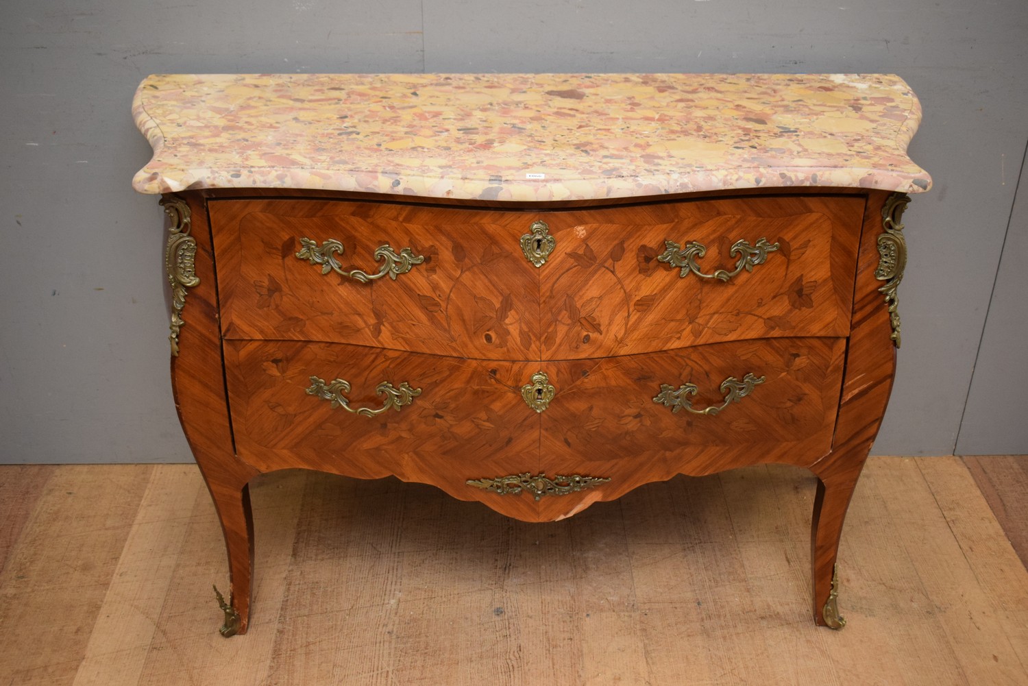 A FRENCH LOUIS XV KINGWOOD MARQUETRY 2 DRAWER COMMODE C.1930'S - WITH A KEY (A/F) (87H x 131W x 50D CM) (PLEASE NOTE THIS HEAVY ITEM MUST BE REMOVED BY CARRIERS AT THE CUSTOMER'S EXPENSE. LEONARD JOEL STAFF CANNOT ASSIST CARRYING THIS ITEM) (X-LARGE ITEM)