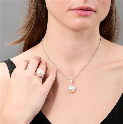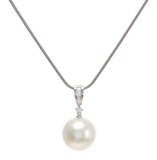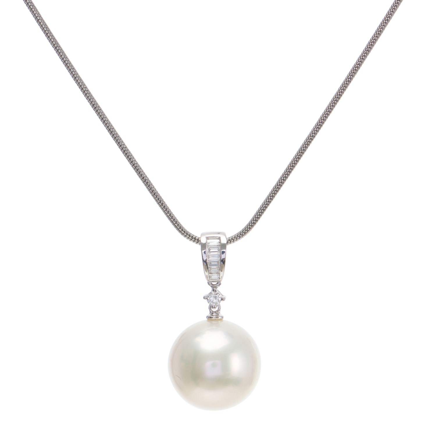 The pendant presents in excellent, as new condition. Diamonds totalling 0.12cts and of a good commercial colour and clarity. Pearl having an excellent lustre with very minor pitting to skin. Total length 25mm. Display chain only.