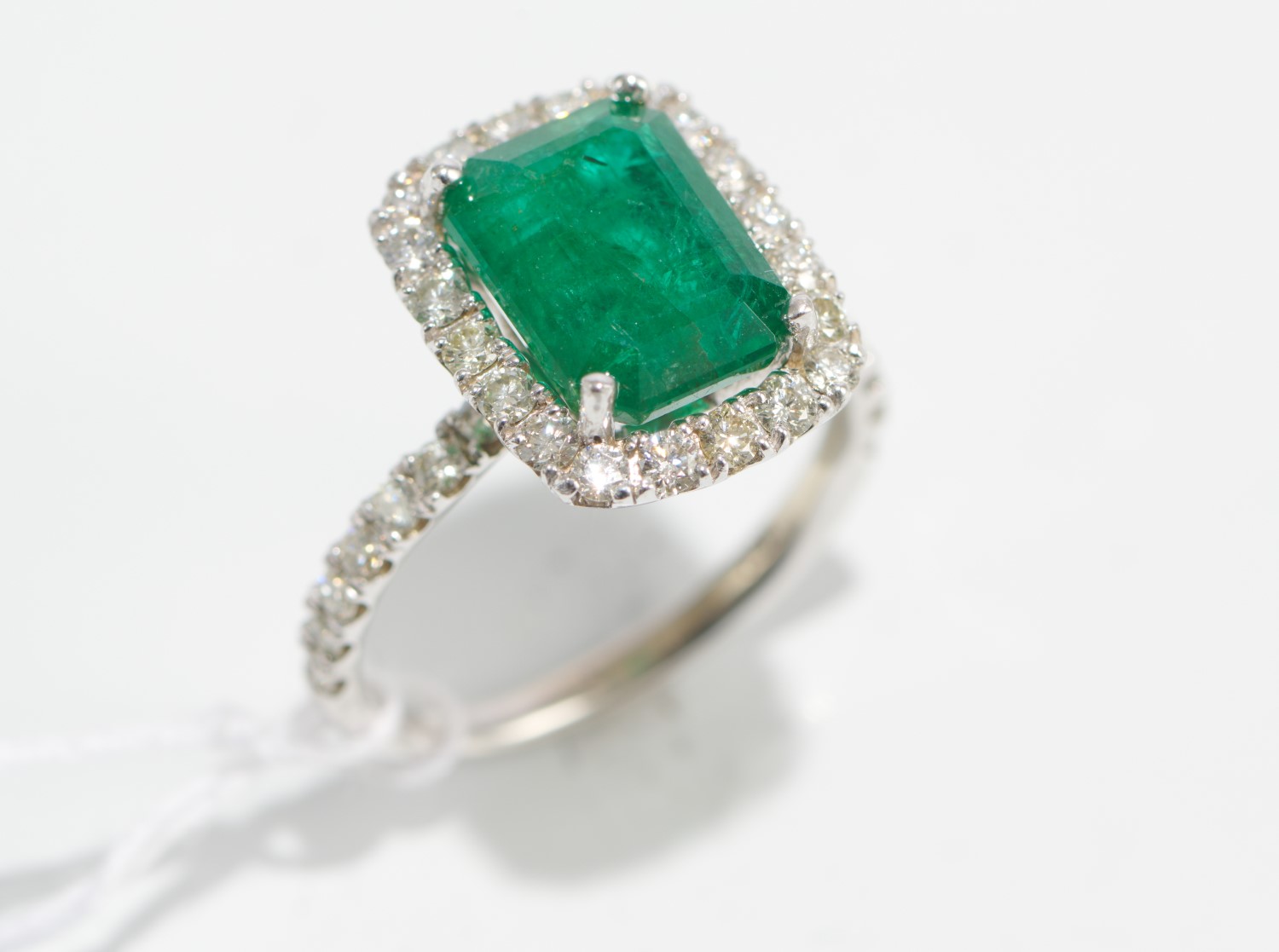 AN EMERALD AND DIAMOND RING An emerald cut emerald weighing 5cts, within a surround of twenty round brilliant cut diamonds totalling 0.88 cts claw, in 14ct white gold.
